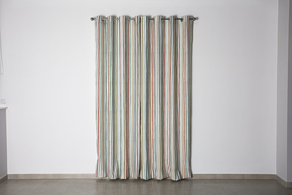 Cortina Irma, confeccionada en Jacquard estampado de rayas, 70% poliéster y 30% algodón. Con ollaos para fácil instalación. Lavable a máquina. Certificado Oeko-Tex®. Disponible en dos tamaños: 140×260 cm y 200×260 cm.