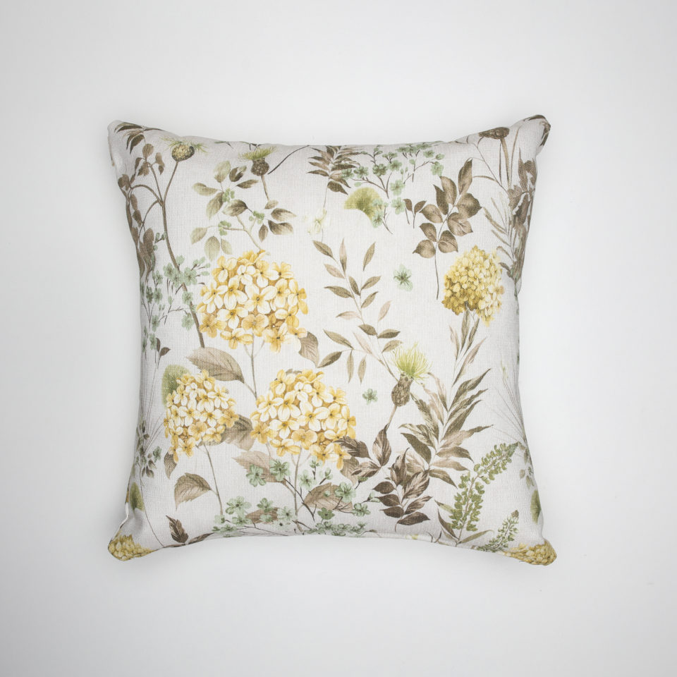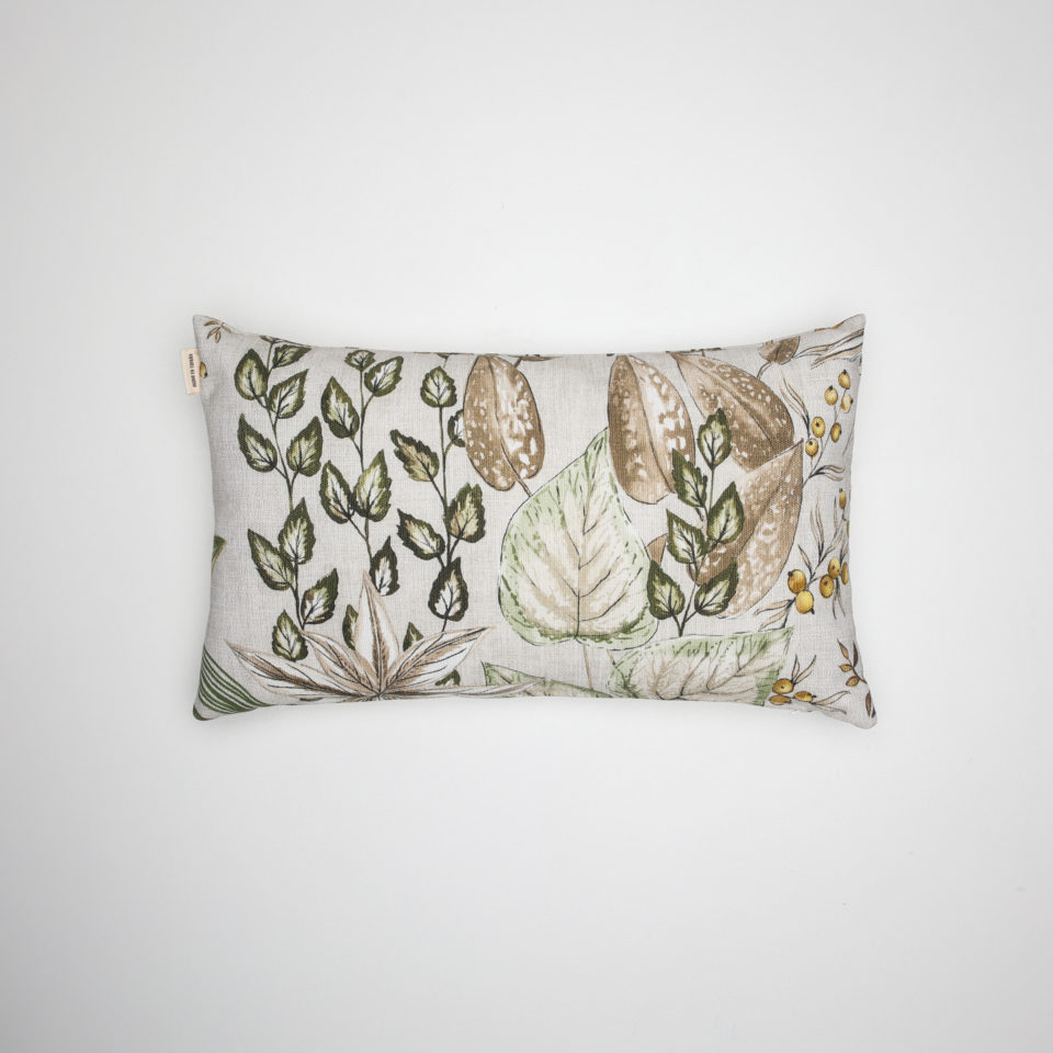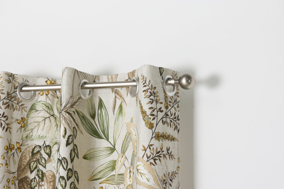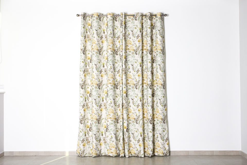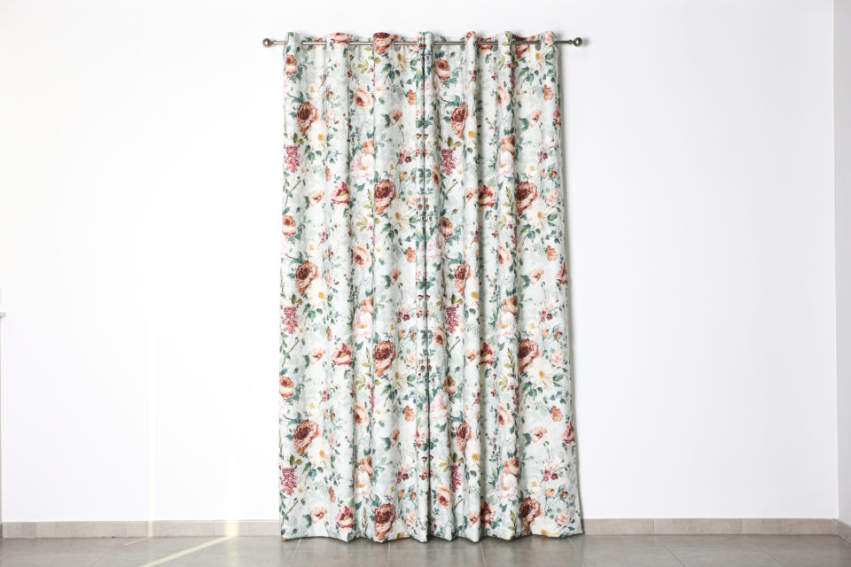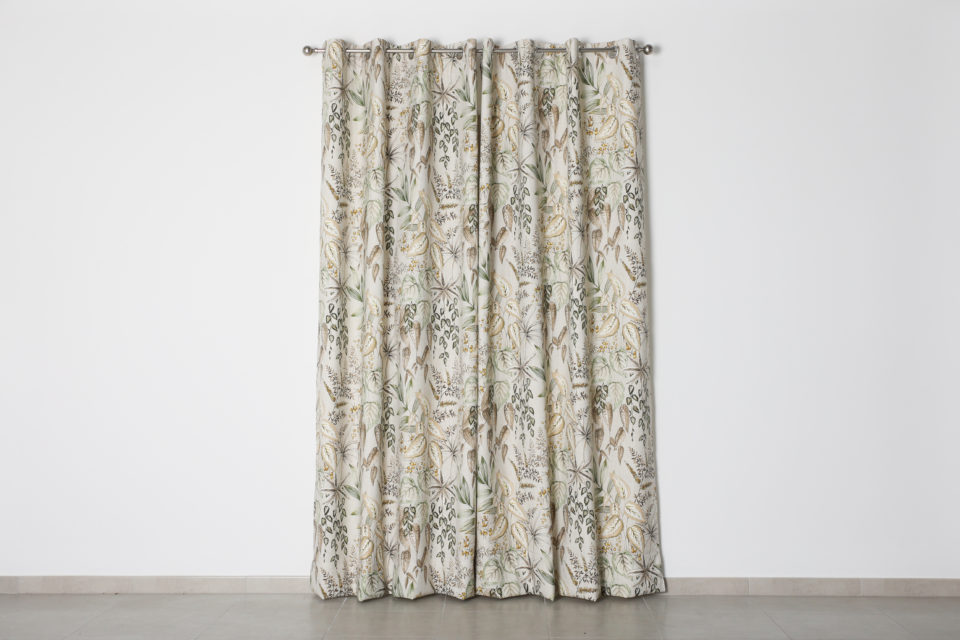Cortina confeccionada India, Jacquard estampado floral, composición 70% poliéster 30% algodón, con ollaos. Certificado Oeko-Tex®.