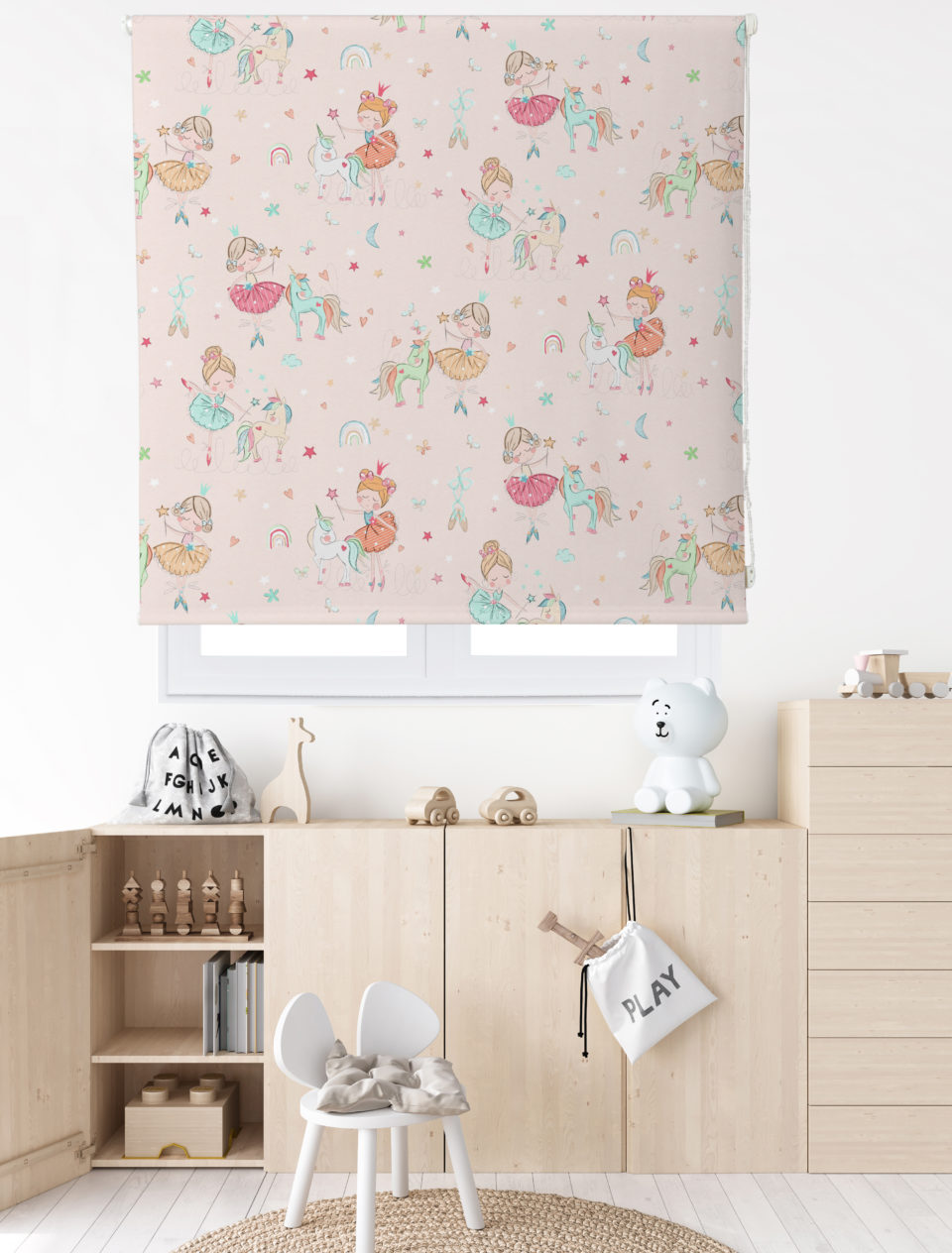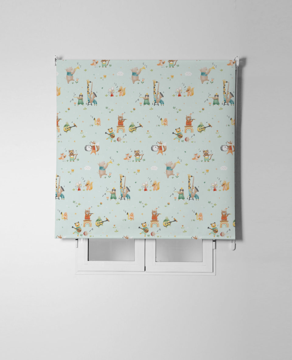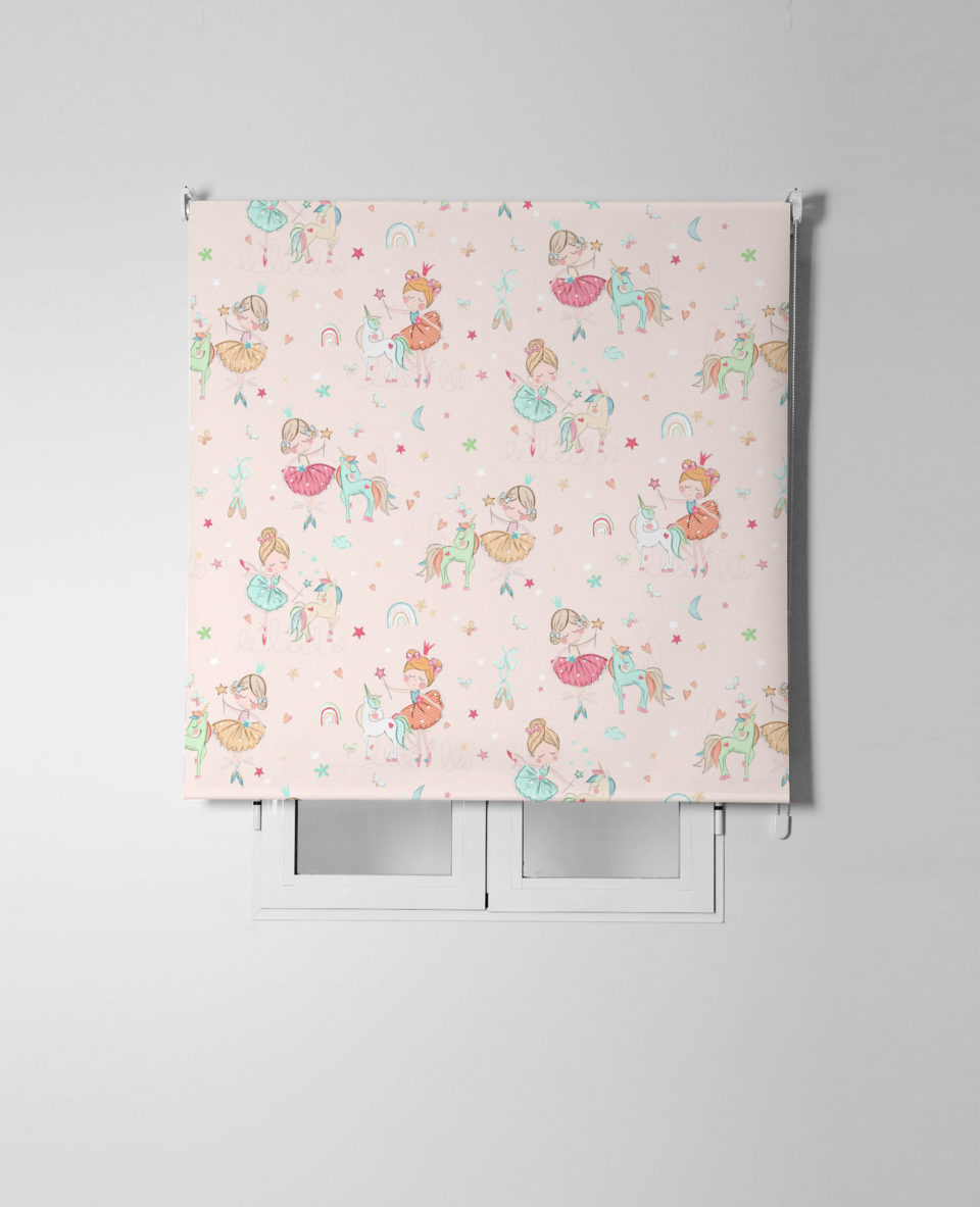 Estor enrollable infantil ARIEL, ideal para la habitación de los más pequeños. Con estampado de motivos infantiles sobre satén resinado, composición 65% poliéster y 35% algodón, fácil de limpiar y con mecanismo de seguridad infantil.