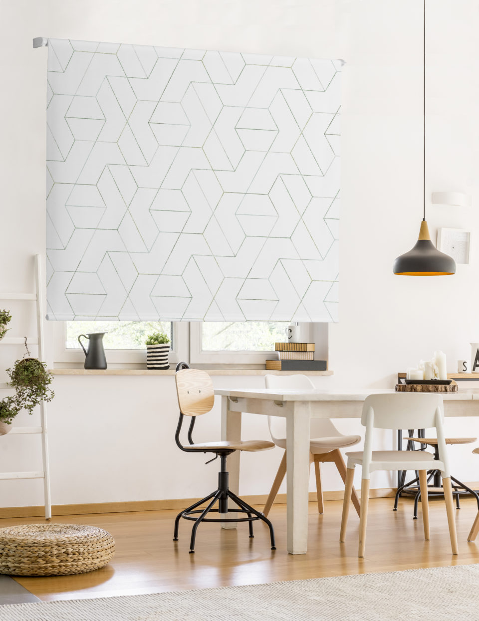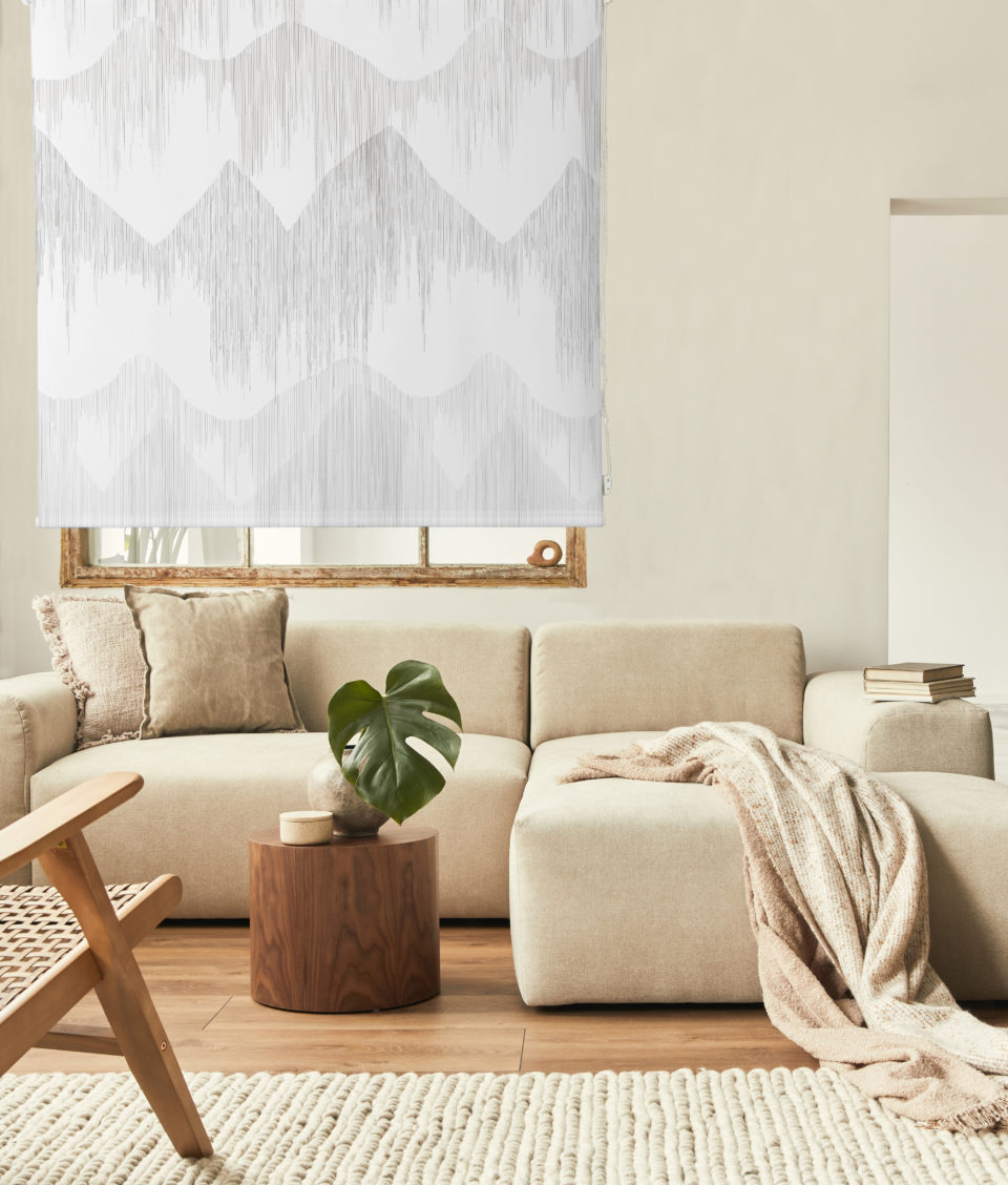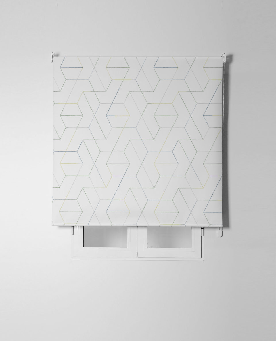Estor enrollable CRAY, estampado geométrico en satén resinado. Composición 65% poliéster y 35% algodón, semitranslúcido y de fácil limpieza. Incluye mecanismo de seguridad infantil y es de fácil instalación.