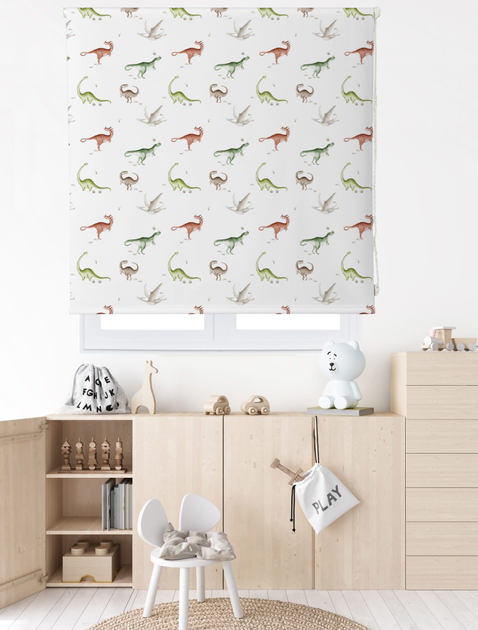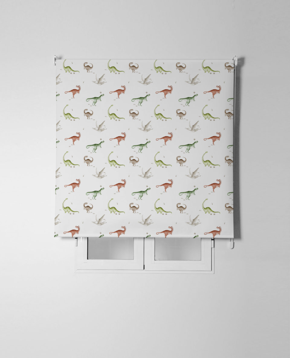 Estor enrollable infantil DINOS, con divertido estampado sobre satén resinado. Fabricado con un 65% de poliéster y un 35% de algodón, fácil de limpiar y con mecanismo de seguridad infantil.