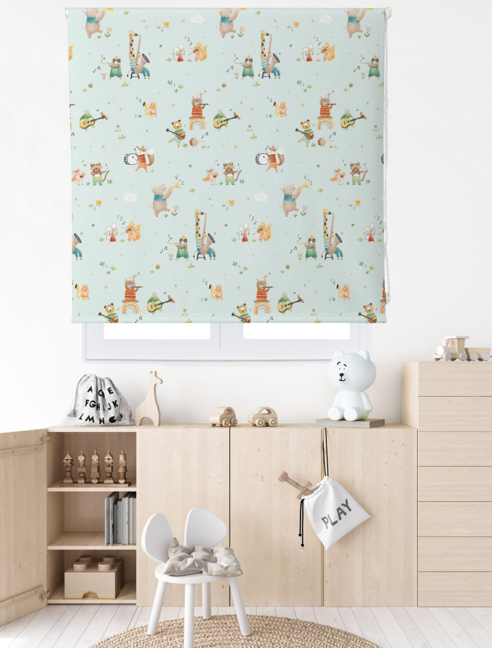 Estor enrollable infantil PANDA, con encantador estampado sobre satén resinado. Fabricado con un 65% de poliéster y un 35% de algodón, fácil de limpiar y con mecanismo de seguridad infantil.