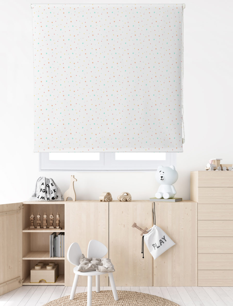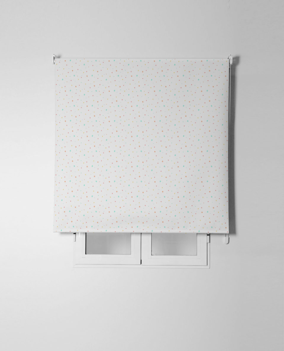 Estor enrollable infantil PUNTOS, con divertido estampado sobre satén resinado. Fabricado con un 65% de poliéster y un 35% de algodón, fácil de limpiar y con mecanismo de seguridad infantil.